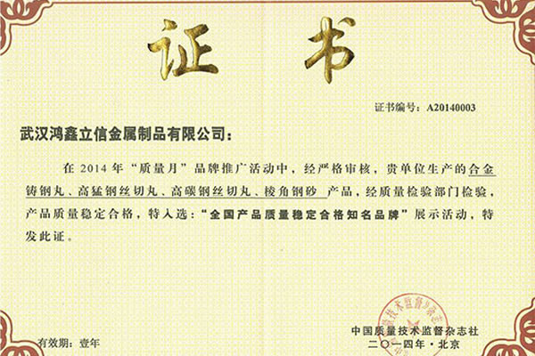 武漢鴻鑫立信金屬制品有限公司主要從事鋼丸、鋼絲切丸、鋼砂等除銹防腐耗材的生產(chǎn)和銷售。公司所有產(chǎn)品均通過ISO9001**質量認證,2014年更獲得了第三屆中國金屬磨料行業(yè)具有影響力品牌-華尊獎。董事長陳群芝女士從事行業(yè)17年來專注為客戶節(jié)約鋼丸消耗成本,2014年獲得了華尊獎-中國品牌建設實踐百名創(chuàng)新很好企業(yè)家的榮譽。服務過的國家建設項目有:北京鳥巢體育館、遼寧號航母、杭州灣跨海大橋、南海軍艦、成都雙流**機場、南車集團動車檢測中心、武漢火車站、武漢天興洲大橋等,同時服務的行業(yè)囊括橋梁制造、船舶制造、汽車制造、火車車輛制造、大理石打磨、鑄件清砂、各種機械制造表面清理等。鴻鑫鋼丸,值得信賴。